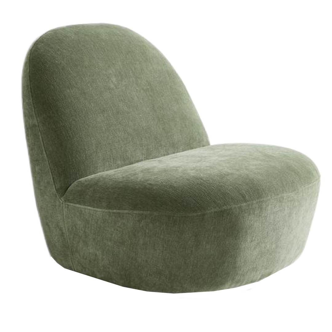 The Clover Armchair in sage green features a soft, pebble-shaped silhouette and premium textured upholstery, offering a sculptural and inviting statement piece for contemporary event lounges.