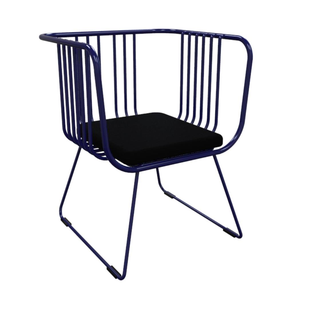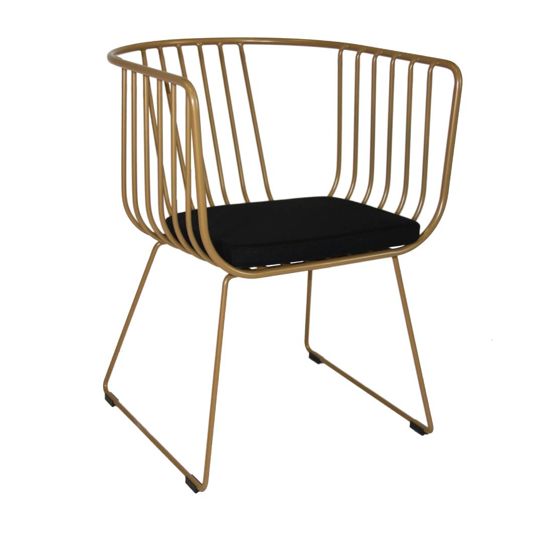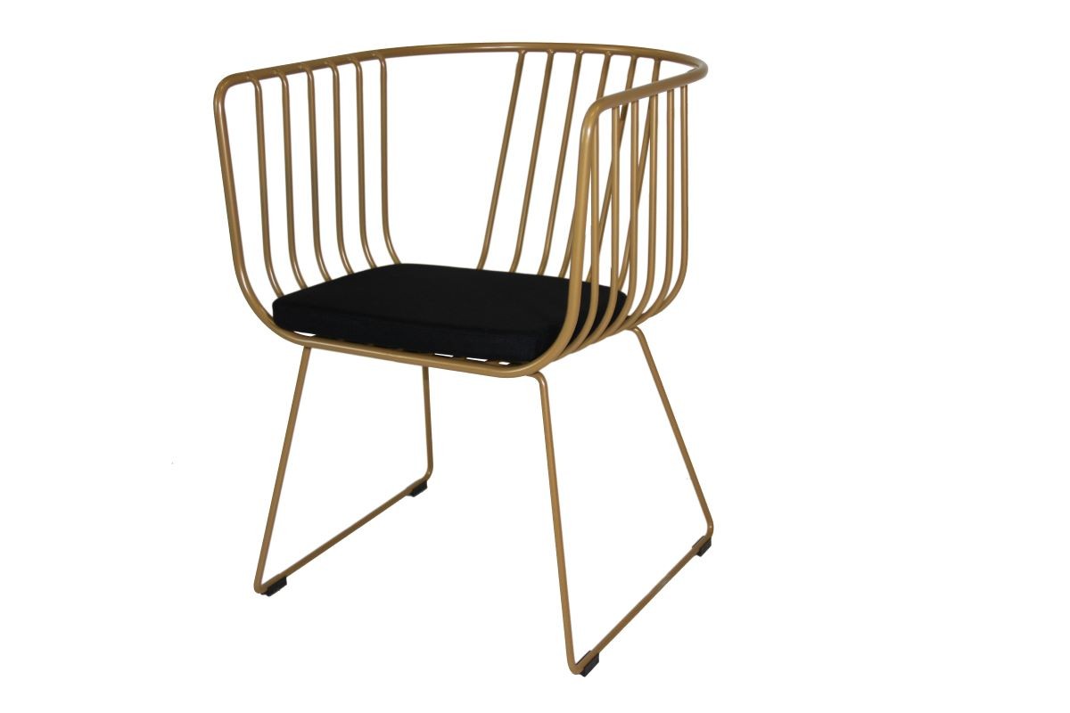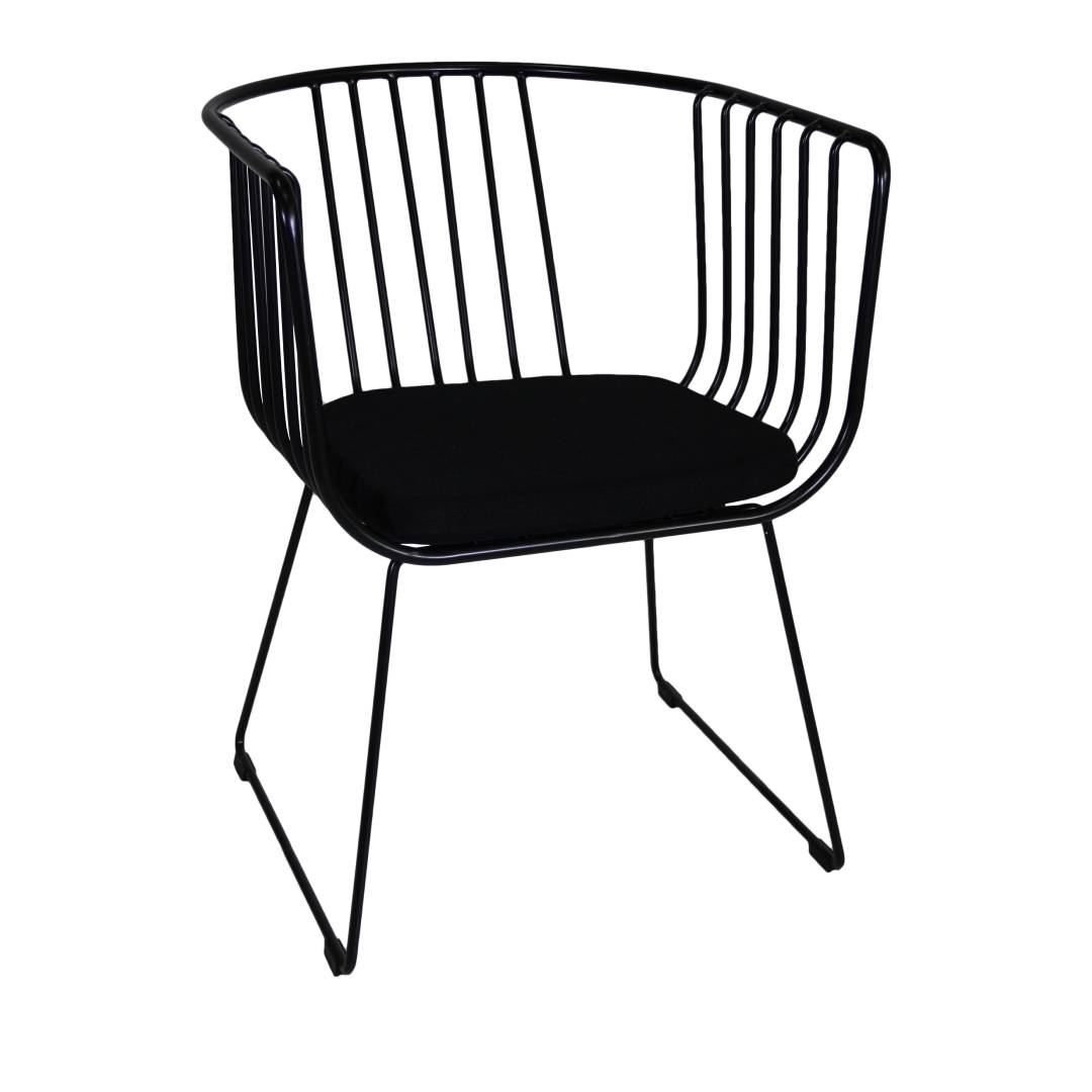 A modern wired chair with a black cushioned seat