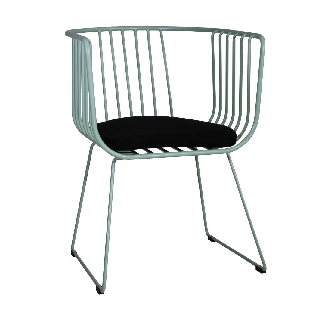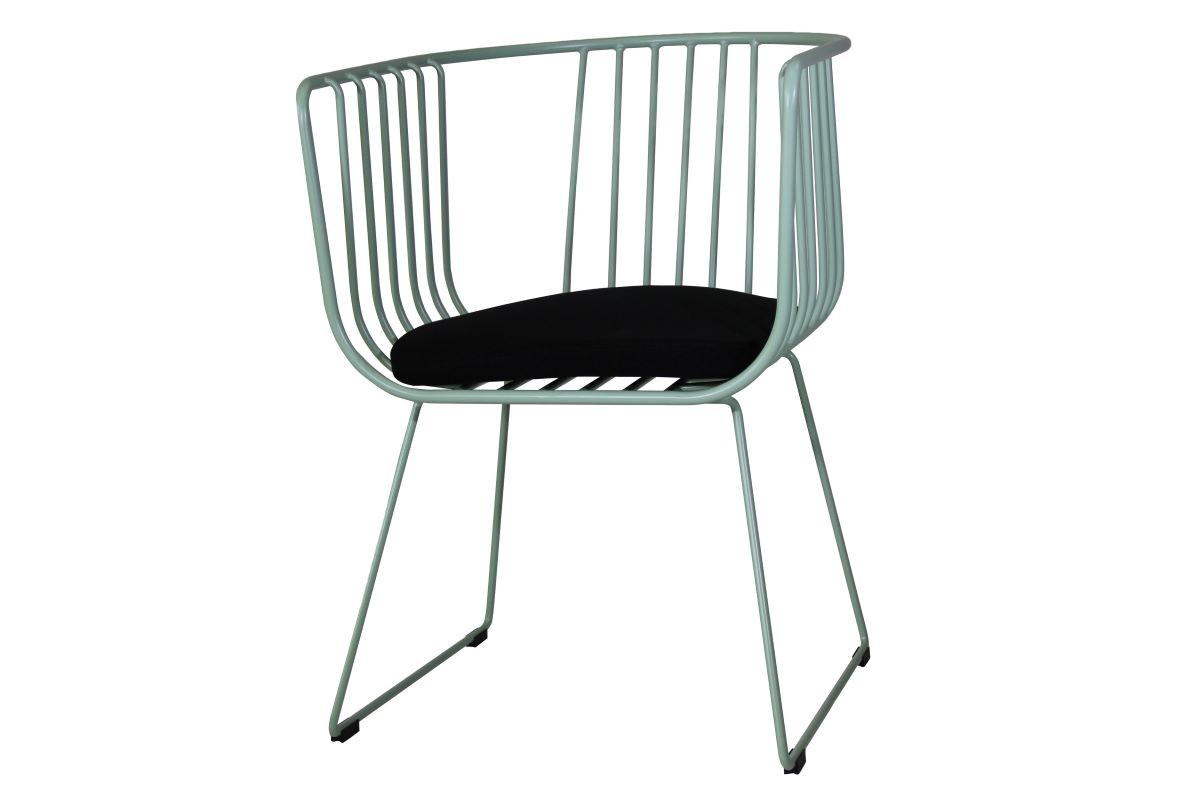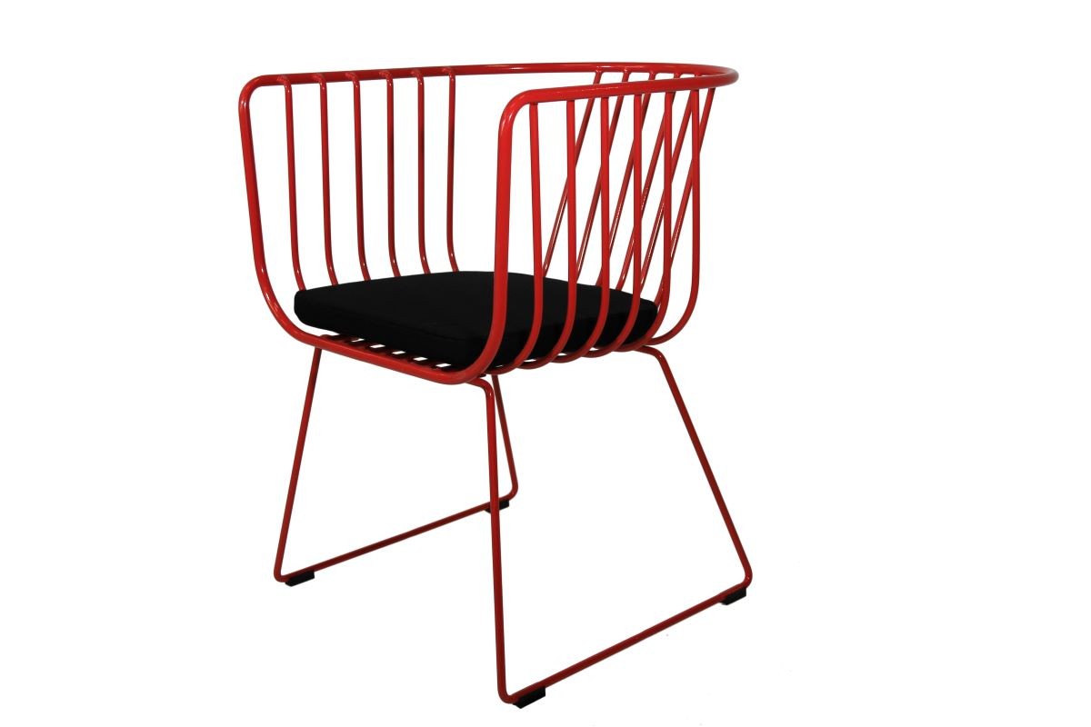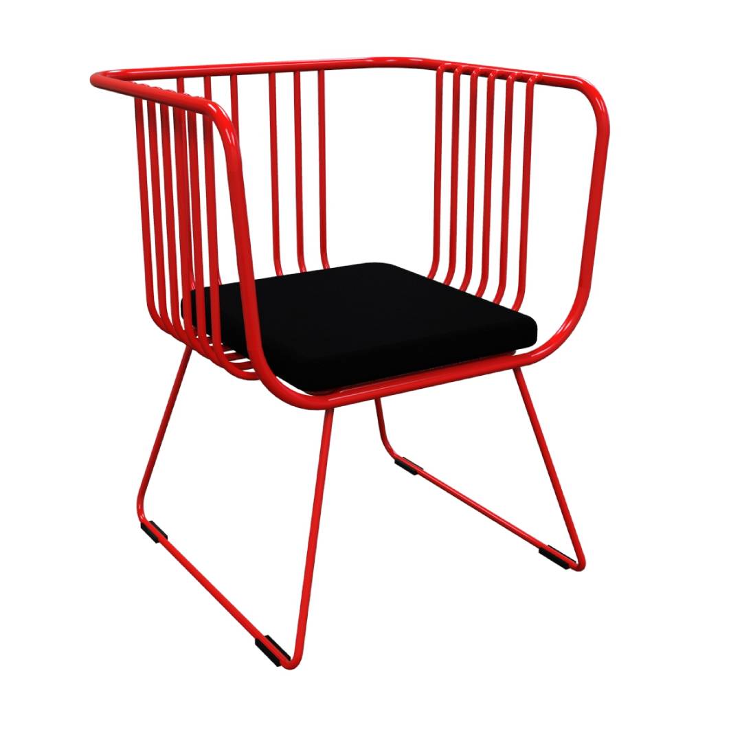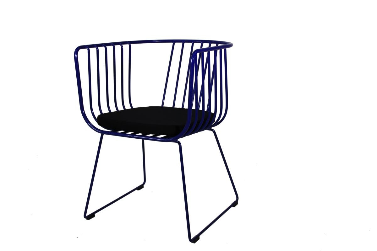 A modern wired chair with a black cushioned seat