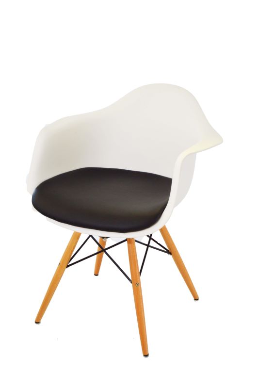 A Scandi bucket style seat with a black cushion. The perfect feature chair