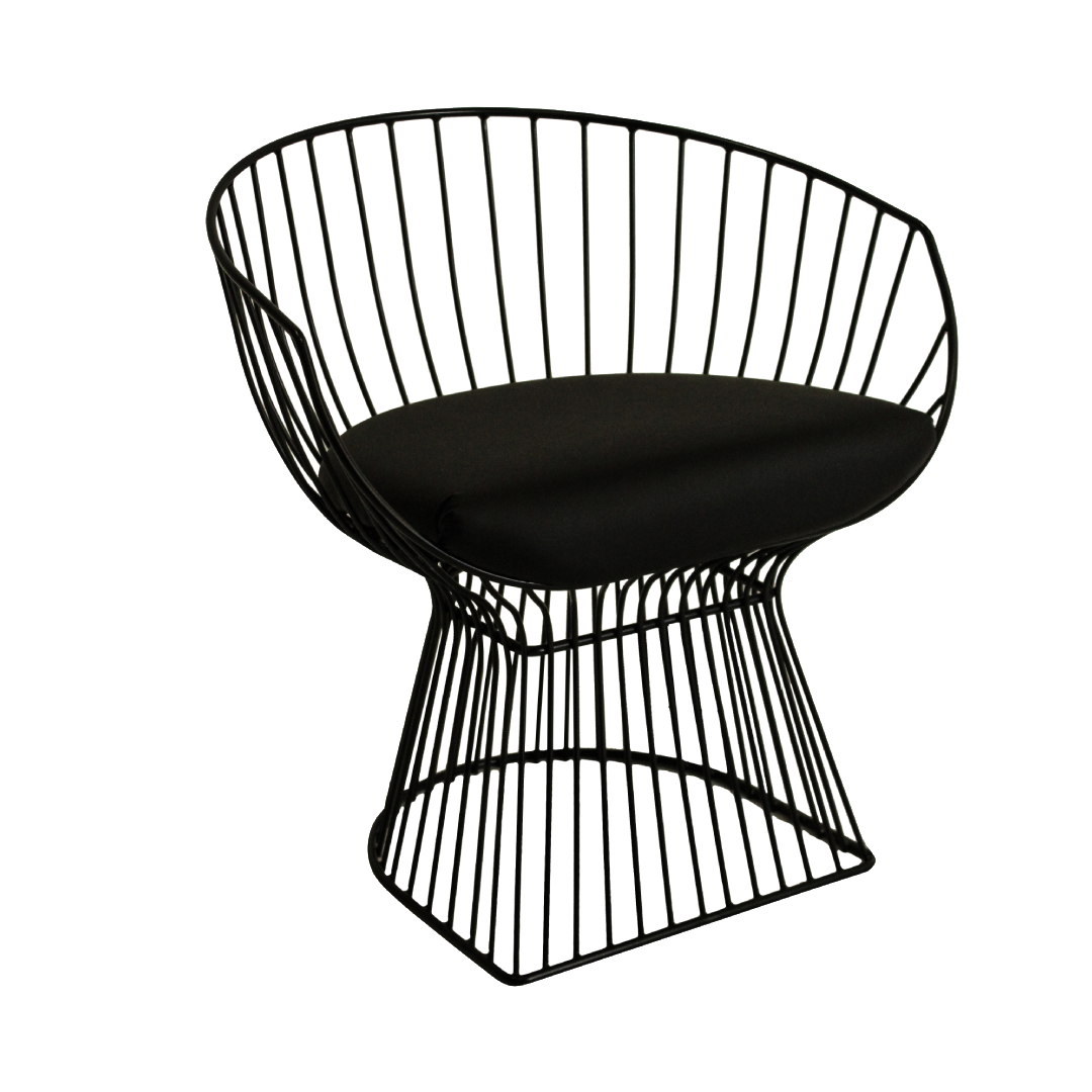 A modern wired chair with a black cushioned seat