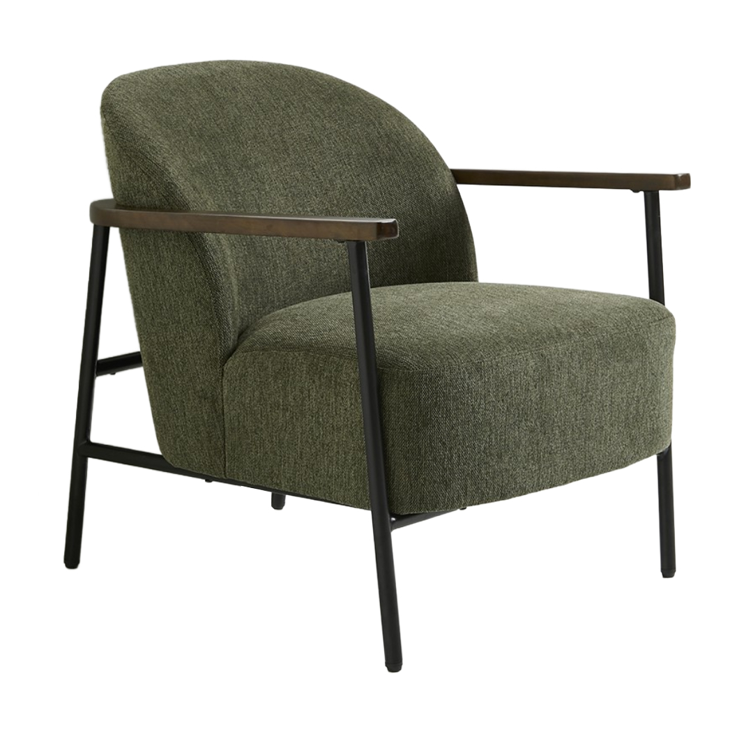 The Thello Chair in sage green features a textured, woven upholstery and a minimalist industrial-style frame with elegant timber armrest accents. This modern accent chair combines a curved, ergonomic silhouette with a sophisticated earthy palette, making it a versatile seating solution for contemporary event lounges.